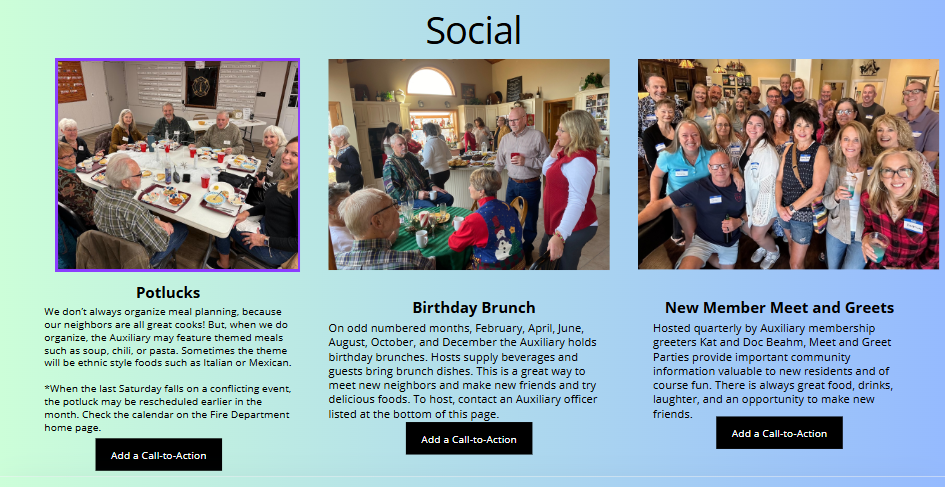 Auxiliary committees organize potluck dinners, luncheons, ice cream socials and other events. The community center also hosts exercise and crafting groups, bingo nights and business meetings. The Auxiliary's fundraising events for emergency responders and firefighters include garage sales and many more ideas to come. If you have any great fundraising ideas please let us know.